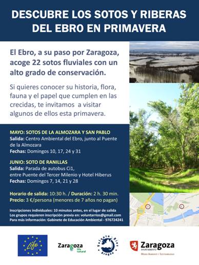 Desde la asociación Volunta-Ríos Aragón queremos invitaros a participar en esta actividad de educación ambiental en torno al río Ebro, que en coordinación con la Agencia de Medio Ambiente y Sostenibilidad / Gabinete de Educación Ambiental del Ayuntamiento de Zaragoza, se va a llevar a cabo a partir del próximo domingo día 10 de mayo. Recorreremos algunos de los sotos de Zaragoza durante varios domingos: